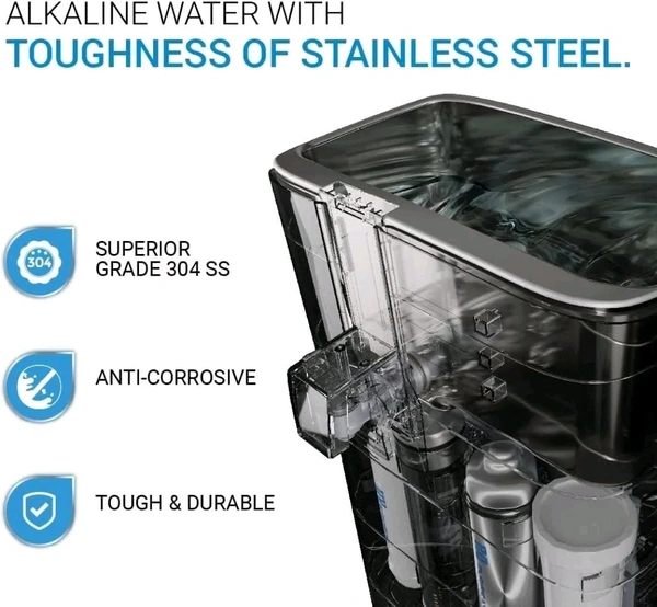 Aquaguard Superio RO+UV+MTDS with Alkaline Boost Technology elevates water pH to neutralize acidity, stored in a 304 Grade Stainless Steel tank for purity and durability.