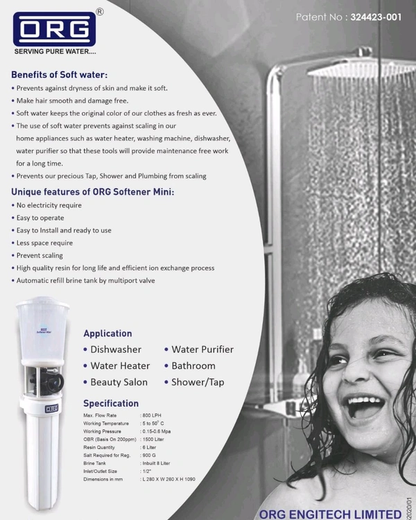 ORG Softener Mini is a minimum maintenance sleek product that gives you soft water. This product can be installed at every point of use application like Washing Machine, Dish Washer, or Individual Bathroom. It can be also wall mounted. It uses lon-exchange technology for softening and comes with a manual multi-port valve avoiding so many operative valves for regeneration. It can be installed in the existing plumbing system.